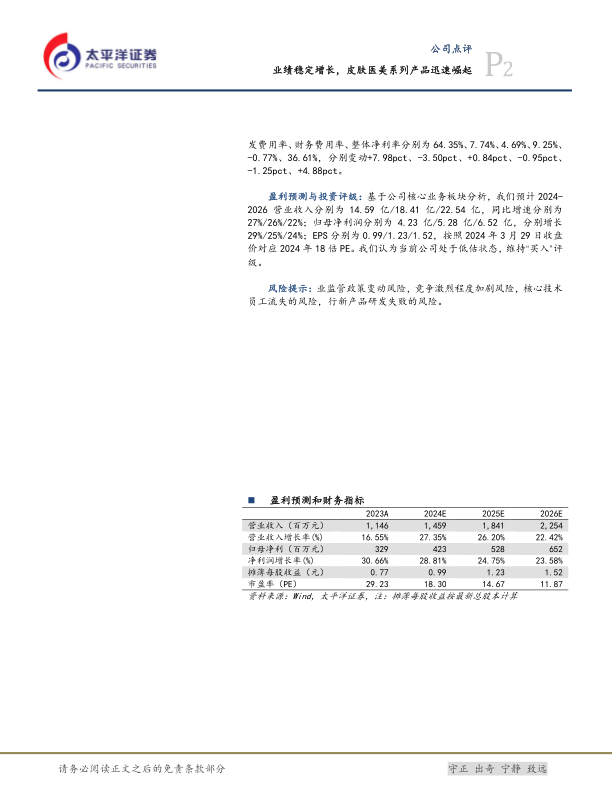 值得关注的是,公司的皮肤医美系列产品迅速崛起,获得行业认可,成为新的增长点。基于核心业务板块的分析,预计未来几年公司营收和净利润将保持稳定增长,维持“买入”评级。