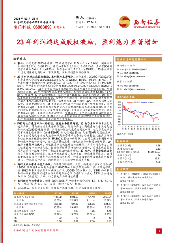 普门科技2023年年报显示,公司在复杂市场环境下展现出强劲的盈利能力。尽管受医疗反腐影响,全年营业收入11.5亿元,同比增长16.6%,略低于预期,但归母净利润和扣非归母净利润分别实现30.7%和34.4%的显著增长,达到3.3亿元和3.1亿元,符合市场预期。公司通过产品结构优化,特别是高毛利试剂产出占比的提高以及皮肤医美新产品的贡献,使得毛利率显著提升7.3个百分点至65.8%,净利润增速远超收入增速,凸显了其卓越的成本控制和盈利效率。此外,2023年8月底发布的股权激励计划有效提振了四季度业绩,进一步巩固了全年利润表现。