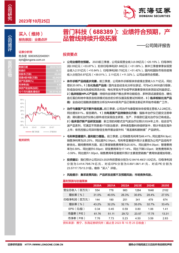 东海证券维持对普门科技的“买入”评级,并给出了未来三年的盈利预测。同时,报告也提示了集采政策、研发进展和市场竞争等风险因素,提醒投资者关注。
