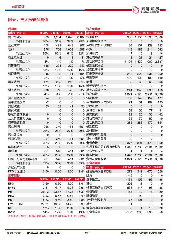 投资建议:我们预计公司2023-2025年的营收分别为12.84/16.48/21.02亿元,归母净利润分别为3.41/4.79/6.74亿元,对应EPS分别为0.80/1.06/1.41元,对应PE分别为23.57/17.75/13.31倍。维持“买入”评级。