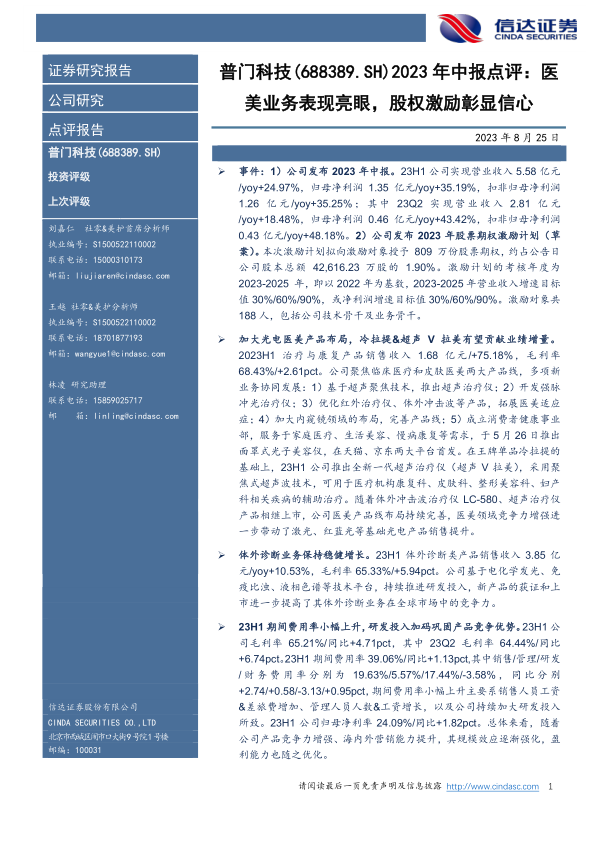 本报告对普门科技2023年中报进行了分析,公司业绩表现良好,体外诊断业务稳健增长,同时积极布局医美领域,有望成为新的增长点。股权激励计划的推出也显示了公司对未来发展的信心。但同时也需关注行业竞争、研发进度和销售推广等风险因素。
