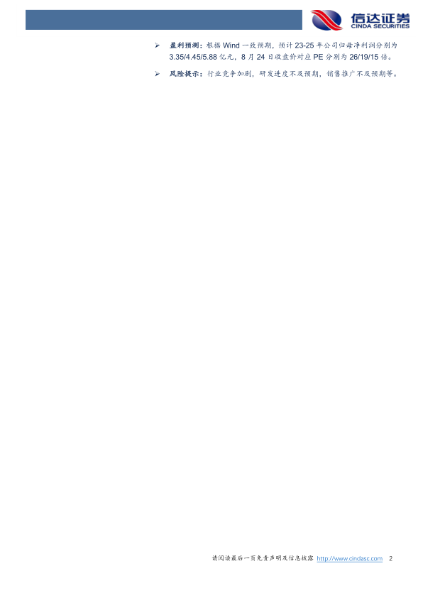 盈利预测:根据Wind一致预期,预计23-25年公司归母净利润分别为3.35/4.45/5.88亿元,8月24日收盘价对应PE分别为26/19/15倍。
