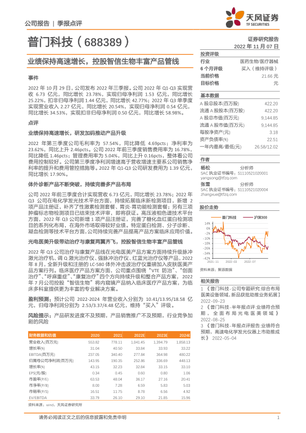 普门科技在2022年前三季度保持了高速增长的势头,通过加大研发投入和拓展产品线,特别是在体外诊断和光电医美领域,不断提升盈利能力和市场竞争力。公司在费用控制方面表现良好,净利润增速高于营收增速。维持“买入”评级,但需关注产品研发、销售推广以及行业竞争等风险。