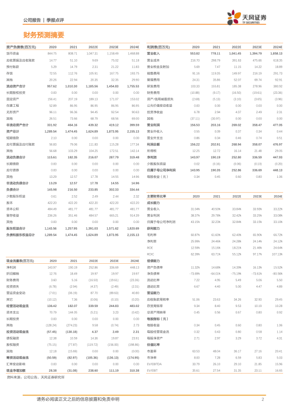 盈利预测:预计公司2022-2024年营业收入分别为10.41/13.95/18.58亿元,归母净利润分别为2.53/3.37/4.48亿元,维持“买入”评级。