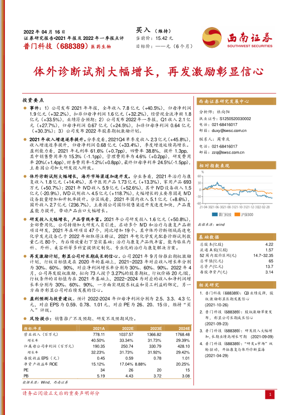 普门科技在2021年及2022年一季度展现出强劲的业绩增长势头,尤其在体外诊断试剂业务和海外市场拓展方面表现突出,成为公司业绩增长的核心驱动力。公司通过持续加大研发投入,不断丰富产品管线,并借助新一轮股权激励计划进一步激发团队活力,彰显了其对长期发展的坚定信心。尽管面临销售推广和研发不及预期等潜在风险,但基于其稳健的财务表现、清晰的增长战略和丰富的产品储备,分析师维持了“买入”评级,并对其未来盈利能力持乐观态度。