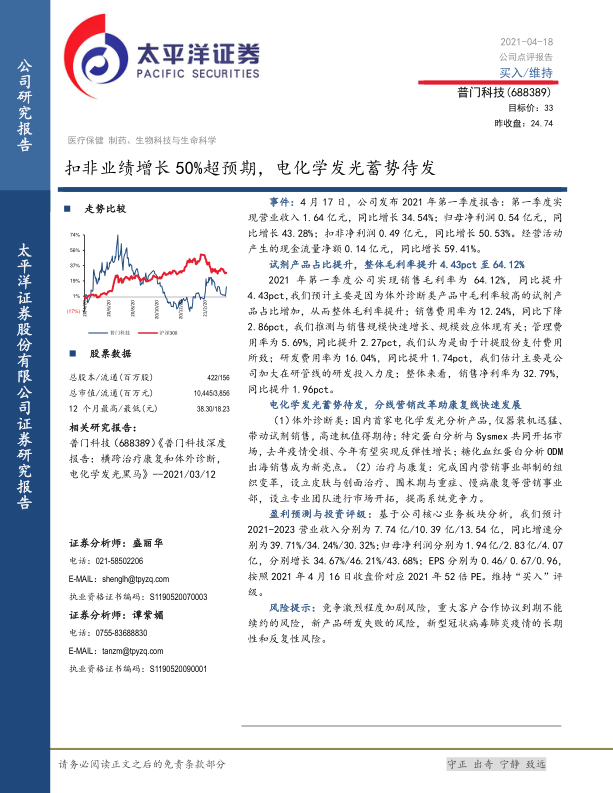 本报告分析了普门科技2021年第一季度业绩,指出公司扣非业绩超预期增长,毛利率和净利率均有所提升。电化学发光业务蓄势待发,有望成为新的增长点。公司在体外诊断和治疗与康复领域均有布局,并积极进行营销改革。维持“买入”评级,但需关注市场竞争、合作续约、研发风险和疫情影响。