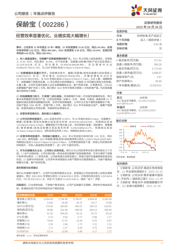 本报告对保龄宝(002286)2021年年报及2022年一季报进行了深入分析,核心观点如下: