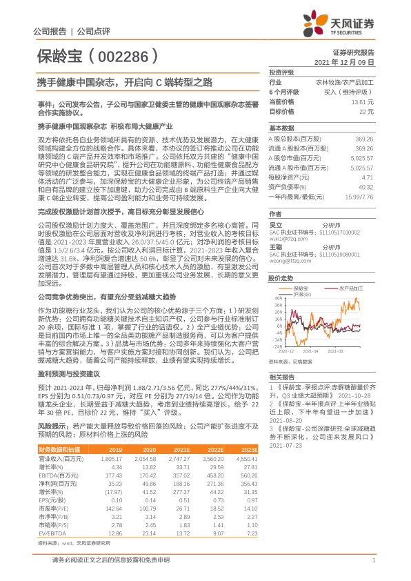 预计2021-2023年,归母净利润1.88/2.71/3.56亿元,同比277%/44%/31%,EPS分别为0.51/0.73/0.97元,对应PE分别为27/19/14倍。公司作为功能糖龙头企业,长期受益于减糖大趋势,考虑到业绩持续高增长,给予22年30倍PE,目标价22元,维持“买入”评级。
