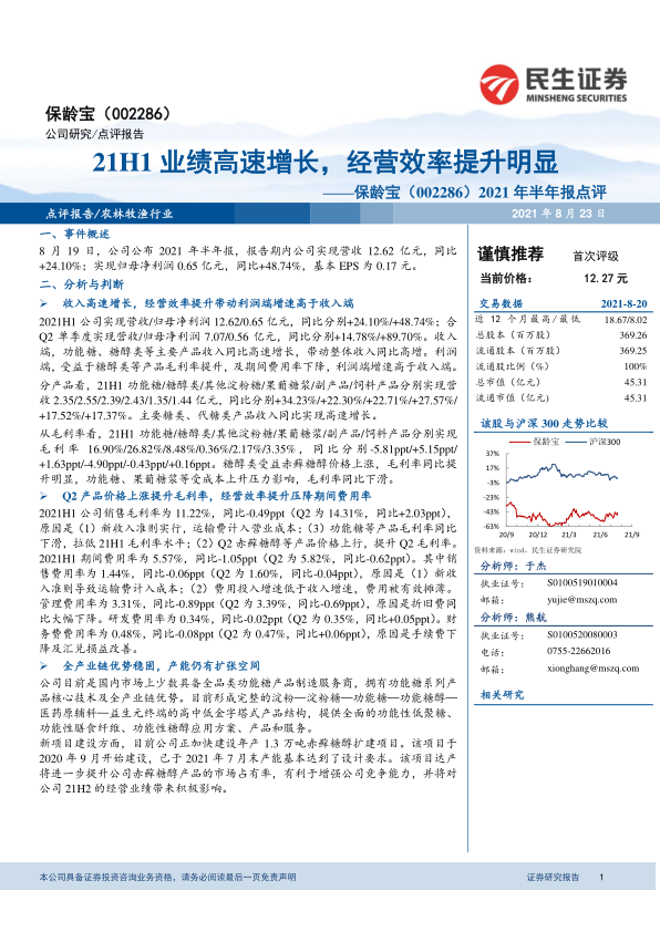 保龄宝在2021年上半年展现出强劲的业绩增长势头,营收和净利润均实现高速增长,尤其第二季度利润增速显著。这得益于核心产品销售的强劲表现、赤藓糖醇价格上涨带来的毛利率提升,以及公司通过优化管理有效压降期间费用率,提升了整体经营效率。公司凭借其全产业链优势和持续的产能扩张(特别是赤藓糖醇项目),为未来的业绩增长奠定了坚实基础。分析师对公司未来盈利能力持乐观态度,并基于其长期成长潜力给予“谨慎推荐”评级,但同时提示了成本波动、产品价格下跌和食品安全等潜在风险。