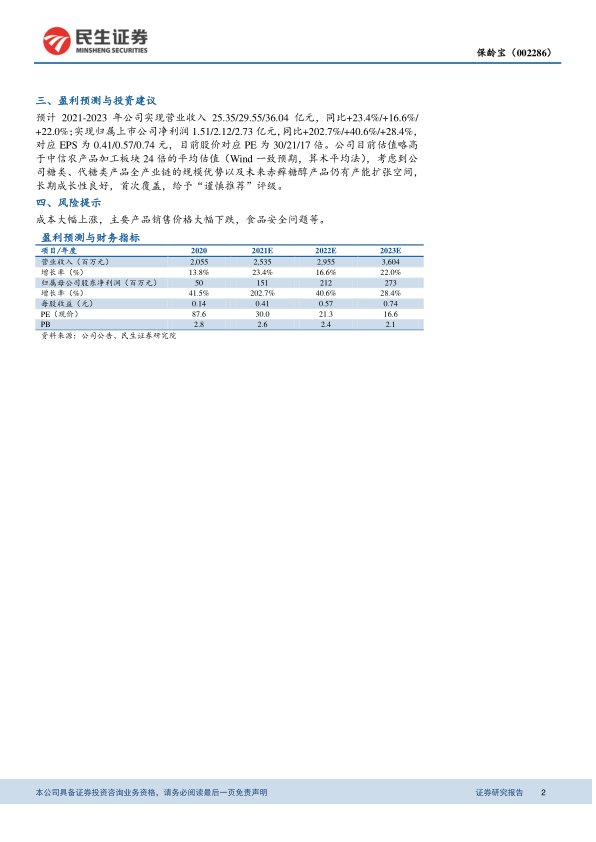 分析师预计公司2021-2023年营业收入将分别达到25.35亿元、29.55亿元和36.04亿元,同比增长23.4%、16.6%和22.0%。归属于上市公司净利润预计分别为1.51亿元、2.12亿元和2.73亿元,同比增长202.7%、40.6%和28.4%,对应每股收益分别为0.41元、0.57元和0.74元。尽管目前股价对应PE略高于中信农产品加工板块的平均估值(24倍),但考虑到公司在糖类、代糖类产品全产业链的规模优势以及赤藓糖醇产品未来的产能扩张空间,公司长期成长性良好。首次覆盖,给予“谨慎推荐”评级。主要风险包括成本大幅上涨、主要产品销售价格大幅下跌以及食品安全问题。