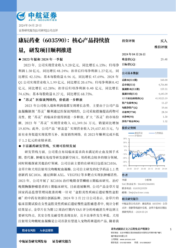 研发管线方面,公司重点布局临床需求尚未满足的止血及围手术期、骨代谢、肿瘤及免疫等研发创新空间大、用药机会较多的细分领域、同时积极探索其他治疗领域。公司目前主要的在研项目包括KC1036、金草片和犬用注射用尖吻蝮蛇血凝酶。公司自主研发的化学药品1.1类创新药KC1036,通过抑制AXL、VEGFR2等多靶点实现抗肿瘤活性。2023年,公司开展了KC1036治疗晚期食管鳞癌Ⅲ期临床研究、治疗晚期胸腺肿瘤患者的Ⅱ期临床研究,目前进展顺利。公司产品金草片是国家药品监督管理局批准的唯一针对“盆腔炎性疾病后遗症慢性盆腔痛”的中药有效部位创新品种,2024年3月22日公司表示,金草片的临床Ⅲ期试验在女性盆腔炎性疾病后遗症慢性盆腔痛患者中,统计分析结果显示,金草片在为期12周治疗期内VAS评分的疼痛消失率达到主要研究终点,其安全性及耐受性表现良好,且不良事件发生率低。犬用注射用尖吻蝮蛇血凝酶是公司首款有望进入宠物药赛道的产品,随着我国宠物外科手术市场逐步打开,未来产品若上市,有望为公司增加新的业绩增长点。整体来看,公司各研发管线有序推进,且部分项目在年内取得了阶段性突破,未来有望支撑公司持续快速发展。