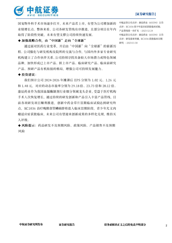 我们预计公司2024-2026年摊薄后EPS分别为1.02元、1.26元和1.48元,对应的动态市盈率分别为29.18倍、23.73倍和20.12倍。康辰药业作为我国血凝酶制剂行业细分领域龙头企业,受益于医疗机构手术人次恢复增长,通过持续的研发创新和产品引入丰富产品管线,目前各项研发项目顺利推进,创新中药金草片Ⅲ期临床试验达到研究终点,KC1036治疗晚期食管鳞癌即将进入临床Ⅲ期阶段,青少年尤文肉瘤适应症获批临床,未来公司有望迎来创新成果的多样化兑现,维持买入评级。