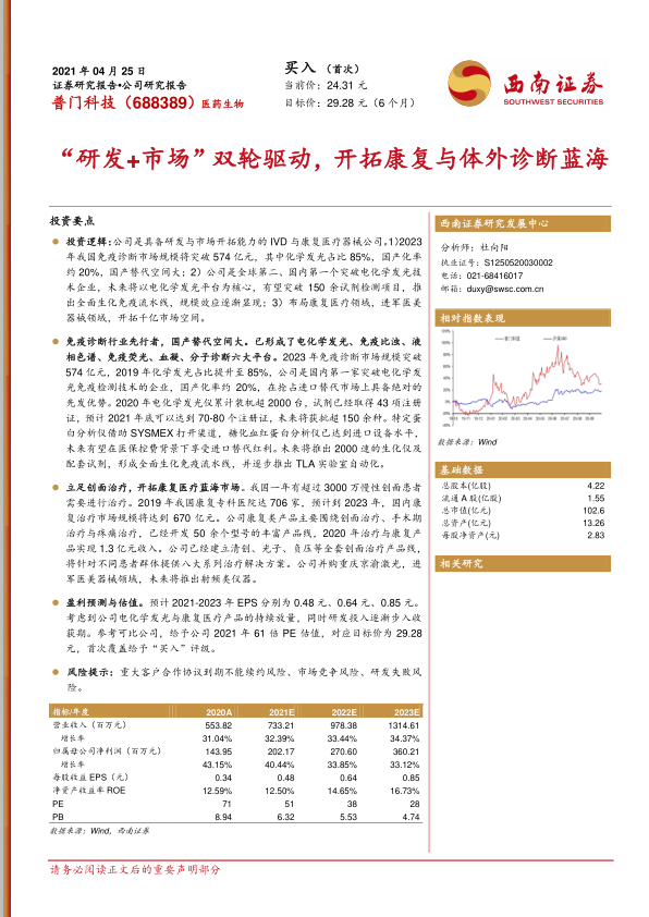 盈利预测与估值。预计2021-2023年EPS分别为0.48元、0.64元、0.85元。考虑到公司电化学发光与康复医疗产品的持续放量,同时研发投入逐渐步入收获期。参考可比公司,给予公司2021年61倍PE估值,对应目标价为29.28元,首次覆盖给予“买入”评级。