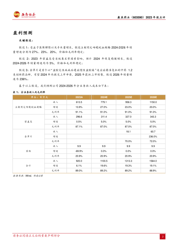 坚持创新核心战略,新药管线日益丰富。2023年公司新药研发快速推进,除了KC1036和金草片外,KC-B173目前已进入临床试验用药品制备阶段,丰富公司凝血管线;犬用注射用尖吻蝮蛇血凝酶注册申请已获受理;KC1086争取早日进入临床研究;CX1003已完成剂量递增的临床安全性试验,药物临床安全性和耐受性良好;CX1026处于临床前阶段。