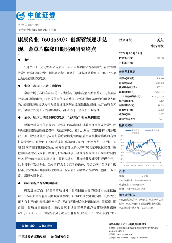 3月22日,公司发布公告表示,公司中药创新产品金草片,在女性盆腔炎性疾病后遗症慢性盆腔痛患者中开展的Ⅱ期临床试验(CTR20222693)已达到主要研究终点