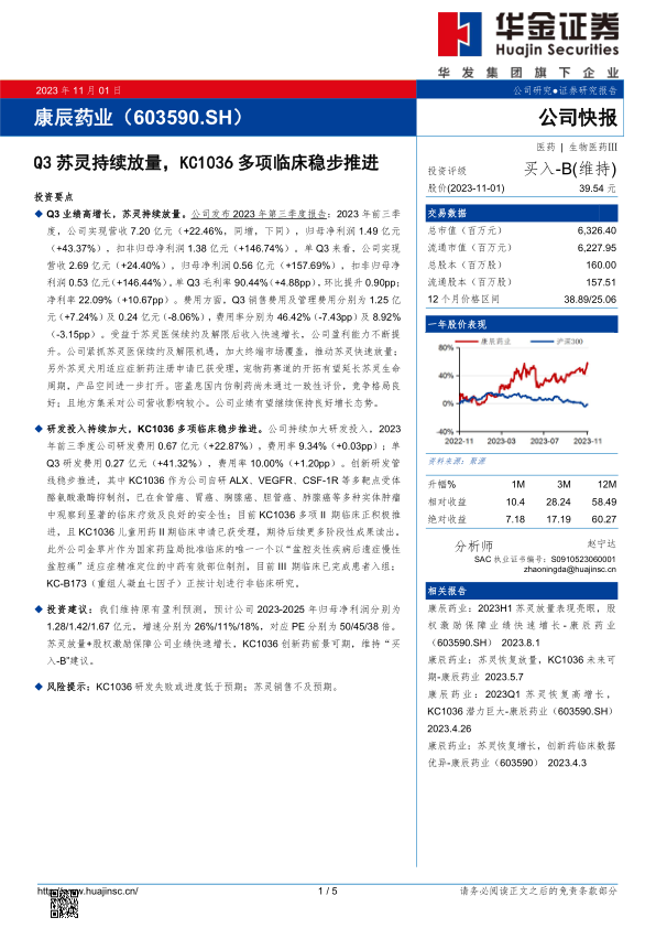 康辰药业在2023年第三季度及前三季度表现出强劲的业绩增长,核心产品苏灵在医保续约和市场拓展的推动下持续放量,显著提升了公司的营收和利润水平。公司在盈利能力和费用控制方面也取得了积极进展,毛利率和净利率均有提升,销售和管理费用率有所下降。同时,公司持续加大研发投入,创新药管线稳步推进,特别是KC1036在多项实体肿瘤临床试验中展现出良好前景,金草片和KC-B173等其他创新项目也按计划进行。尽管面临KC1036研发风险和苏灵销售不及预期的潜在挑战,但基于现有业绩表现和创新药管线的潜力,分析师维持“买入-B”评级,认为公司未来业绩增长可期。