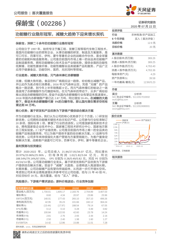 公司通过持续的研发创新、构建完整的全产业链优势以及与可口可乐、百事可乐、伊利、蒙牛等知名企业建立的战略合作关系,形成了坚实的竞争壁垒。这些核心优势使得保龄宝能够为下游客户提供定制化的综合解决方案,有效增强客户黏性。在“减糖”趋势的推动下,公司业绩预计将进入高速增长期,2020-2022年归母净利润预计将实现188.54%、79.14%和67.05%的同比增长。长期来看,公司功能糖产品有望向终端市场延伸,进一步打开增长空间,具备显著的投资价值。