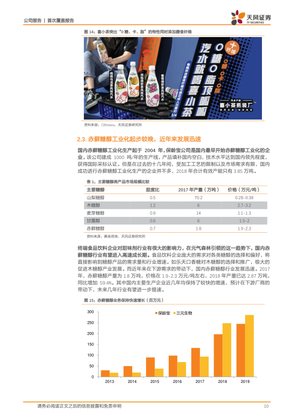 在元气森林的带动下,众多厂商纷纷推出添加赤藓糖醇的饮料,如喜茶旗下的“喜小茶”汽水,线上首发即被抢空。国内赤藓糖醇工业化生产起步较晚,保龄宝公司是国内最早开始工业化的企业。近年来,在下游需求的带动下,国内赤藓糖醇行业发展迅速。2017年,赤藓糖醇产量为1.8万吨,2018年已达2.87万吨,同比增加59.4%。2019年我国糖消费量约为1580万吨,报告假设未来赤藓糖醇代替5%的白糖市场,那么国内潜在需求空间有望达到80万吨,预示着巨大的成长空间。