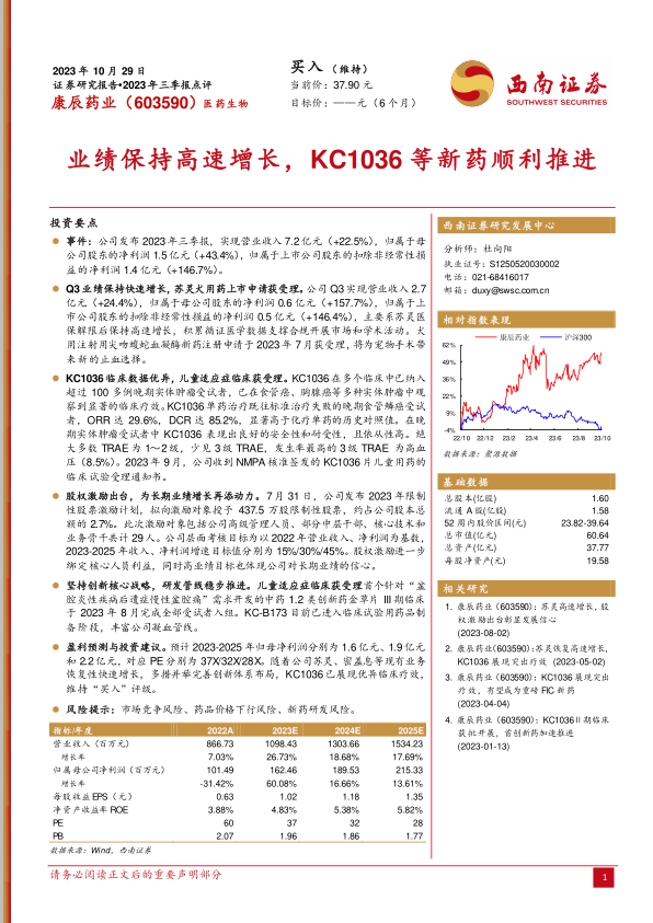 本报告分析了康辰药业2023年三季报,公司业绩保持高速增长,苏灵医保解限后市场表现强劲,KC1036等新药研发进展顺利,临床数据优异。公司推出股权激励计划,绑定核心人员利益,彰显了对未来发展的信心。维持“买入”评级,但需关注市场竞争、药品价格下行以及新药研发等风险。