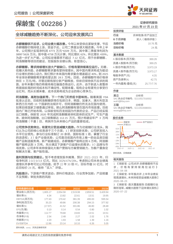 基于减糖趋势和下游客户的带动,预计公司糖醇业务将进入高速增长期,赤藓糖醇将处于满产满销状态,产品价格上涨将带动毛利率提升。同时,其他主要业务也将保持较快增长。我们调整盈利预测,预计2021-2023年公司归母净利润分别为2.0亿元、2.9亿元和3.8亿元,同比增速分别为302%、47%和28%。考虑到公司业绩高速增长,参考可比公司估值,给予2022年30倍PE,对应目标市值90亿元,目标价24元,维持“买入”评级。