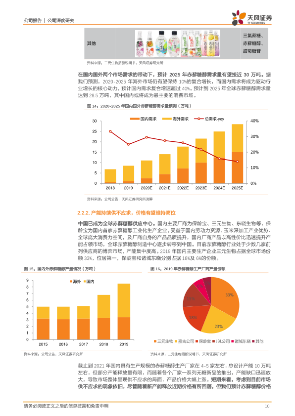 赤藓糖醇作为一种天然、零热量、不参与血糖代谢的甜味剂,下游应用广泛,包括食品饮料、香料日化、医药等领域。欧美发达国家是赤藓糖醇最主要的消费地区,2019年美国和欧洲的消费量分别达到3.6万吨和2.5万吨,2015年至2019年复合增长率分别为9.5%和13.6%。国内市场在元气森林等新锐品牌的带动下,赤藓糖醇消费量进入高速增长期,2019年国内消费量达到1.1万吨,接近2017年的4倍。我们预计,在国内外市场需求的共同驱动下,2025年全球赤藓糖醇需求量有望达到28.5万吨,其中中国市场需求复合增速预计超过40%,将成为最主要的消费市场。