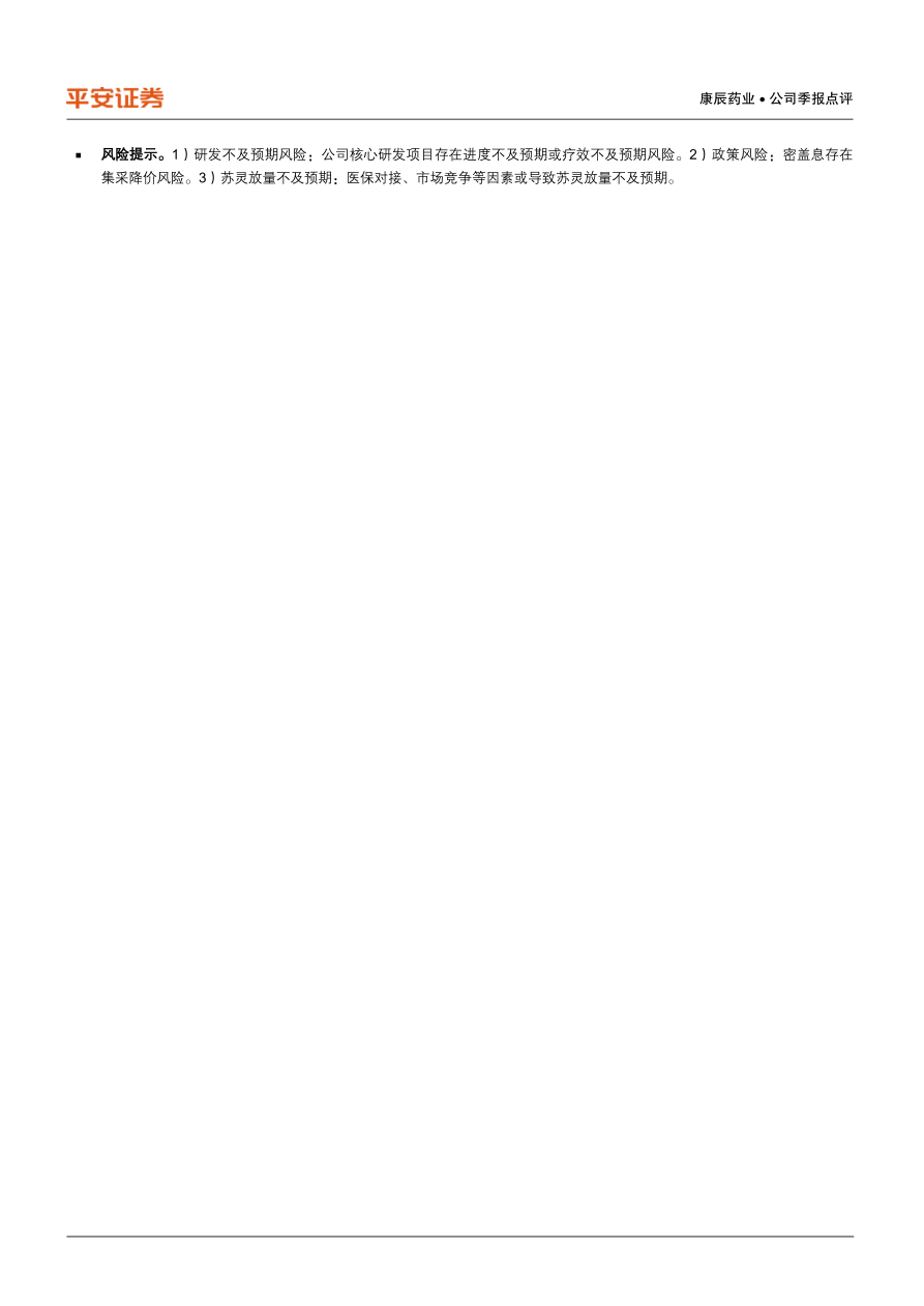 风险提示。1)研发不及预期风险:公司核心研发项目存在进度不及预期或疗效不及预期风险。2)政策风险:密盖息存在集采降价风险。3)苏灵放量不及预期:医保对接、市场竞争等因素或导致苏灵放量不及预期。