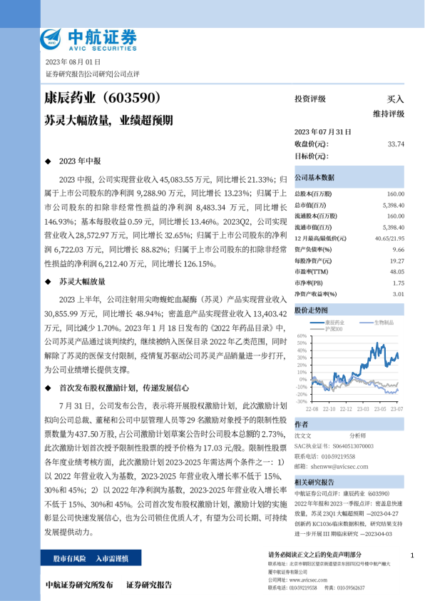 2023上半年,公司注射用尖吻腹蛇血凝酶(苏灵)产品实现营业收入30,855.99万元,同比增长48.94%;密盖息产品实现营业收入13,403.42万元,同比减少1.70%。2023年1月18日发布的《2022年药品目录》中,公司苏灵产品通过谈判续约,继续被纳入医保目录2022年乙类范围,同时解除了苏灵的医保支付限制,疫情复苏驱动公司苏灵产品销量进一步打开,为公司业绩增长提供支撑。