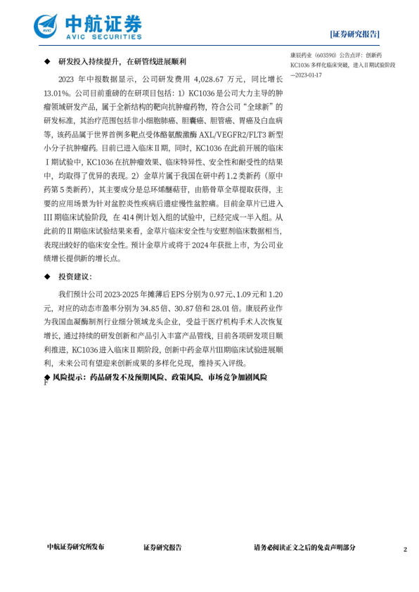 2023年中报数据显示,公司研发费用4,028.67万元,同比增长13.01%。公司目前重磅的在研项目包括:1)KC1036是公司大力主导的肿瘤领域研发产品,属于全新结构的驼向抗肿瘤药物,符合公司“全球新”的研发标准,其治疗范围包括非小细胞肺癌、胆囊癌、胆管癌、胃癌及白血病等,该药品属于世界首例多点受体酪氨酸激酶AXL/VEGFR2/FLT3新型小分子抗肿瘤药。目前已进入临床Ⅱ期,同时,KC1036在此前开展的临床Ⅰ期试验中,KC1036在抗肿瘤效果、临床特异性、安全性和耐受性的结果中,均取得了优异的表现。2)金草片属于我国在研中药1.2类新药(原中药第5类新药),其主要成分是总环烯酰菇营,由筋骨草全草提取获得,主要的应用场景为针对盆腔炎性疾病后遗症慢性盆腔痛。目前金草片已进入Ⅲ期临床试验阶段,在414例计划入组的试验中,已经完成一半入组。从此前的Ⅱ期临床试验结果来看,金草片临床安全性与安慰剂临床数据相当,表现出较好的临床安全性。预计金草片或将于2024年获批上市,为公司业绩增长提供新的增长点。