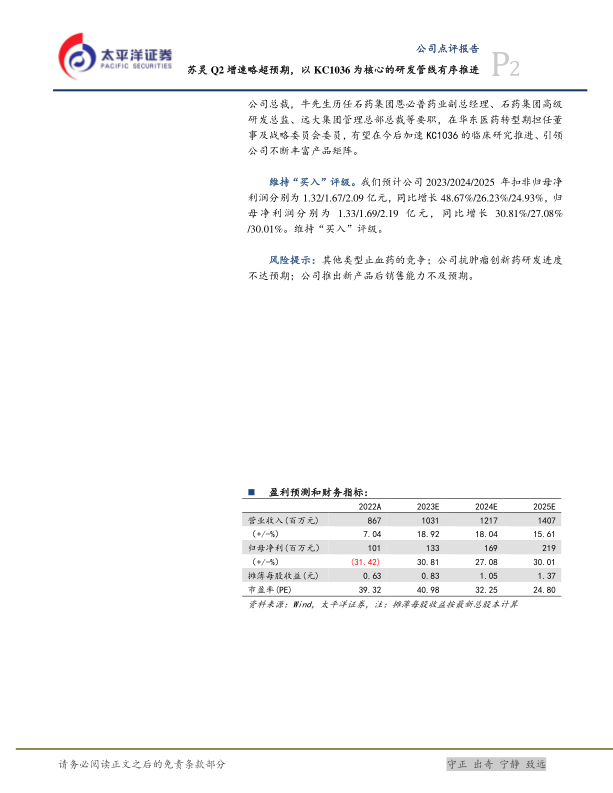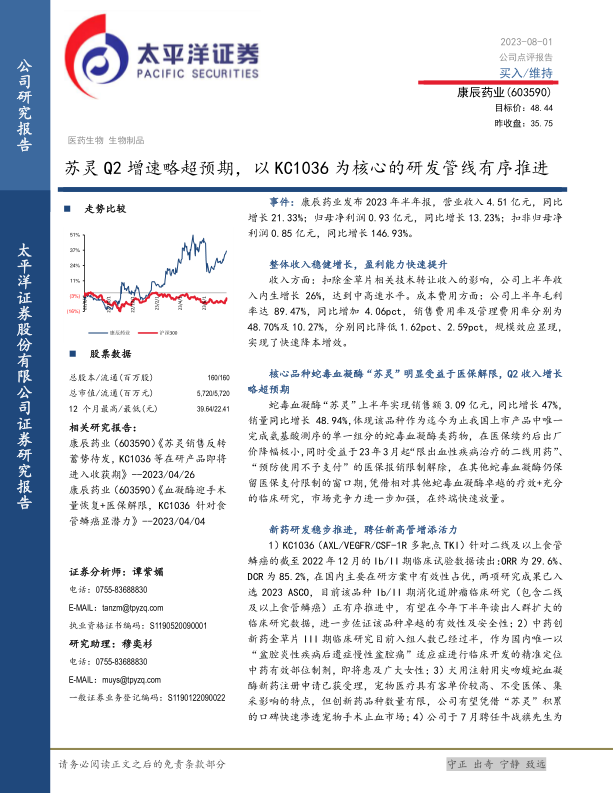 苏灵Q2增速略超预期,以KC1036为核心的研发管线有序推进