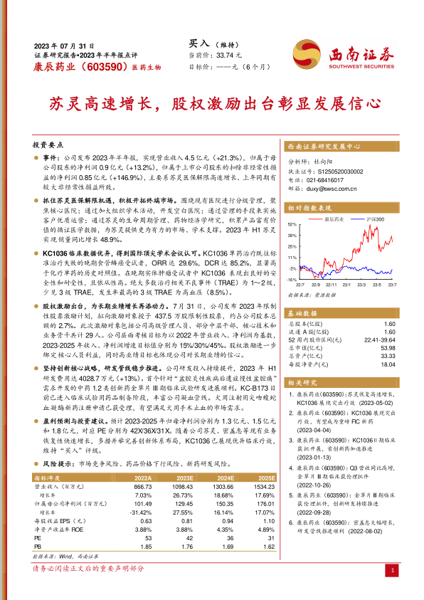 本报告对康辰药业2023年半年报进行了全面分析,认为公司抓住了苏灵医保解限的机遇,积极开拓市场,实现了业绩的快速增长。同时,KC1036的优异临床数据和股权激励计划的推出,为公司的长期发展奠定了基础。维持对康辰药业“买入”评级,但同时也提示了相关风险。