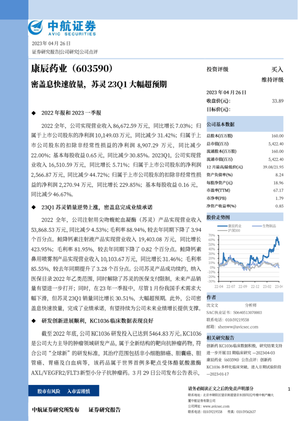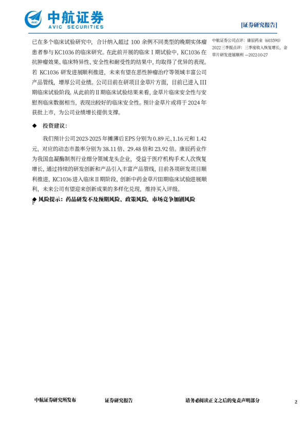 我们预计公司2023-2025年摊薄后EPS分别为0.89元、1.16元和1.42元、对应的动态市盈率分别为38.11倍、29.48倍和23.92倍。康辰药业作为我国血凝酶制剂行业细分领域龙头企业,受益于医疗机构手术人次恢复增长,通过持续的研发创新和产品引入丰富产品管线,目前各项研发项目顺利推进,KC1036进入临床Ⅱ期阶段,创新中药金草片Ⅲ期临床试验进展顺利,未来公司有望迎来创新成果的多样化兑现,维持买入评级。