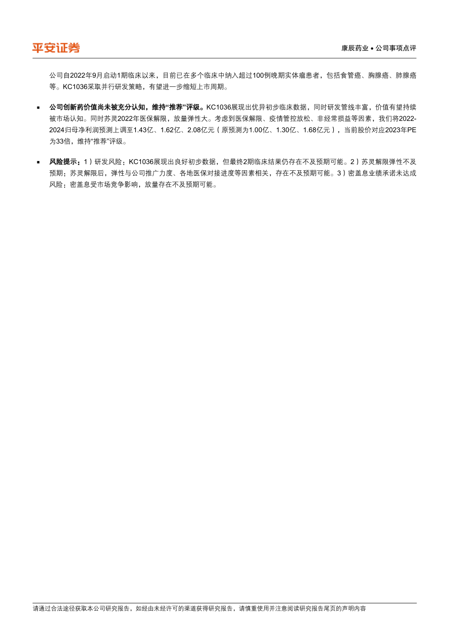 风险提示:1)研发风险:KC1036展现出良好初步数据,但最终2期临床结果仍存在不及预期可能。2)苏灵解限弹性不及预期:苏灵解限后,弹性与公司推广力度、各地医保对接进度等因素相关,存在不及预期可能。3)密盖息业绩承诺未达成风险:密盖息受市场竞争影响,放量存在不及预期可能。