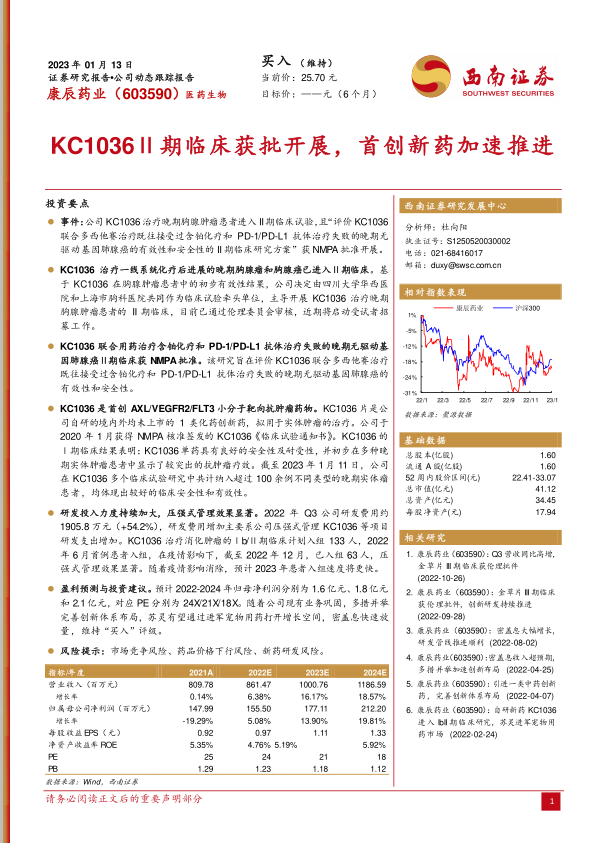 本报告对康辰药业的KC1036临床试验进展进行了详细分析,认为KC1036在治疗晚期胸腺肿瘤和肺腺癌方面具有潜力。公司研发投入的持续加大和创新体系的完善,为未来的业绩增长提供了保障。维持“买入”评级,但同时也提示了市场竞争、药品价格和新药研发等风险。