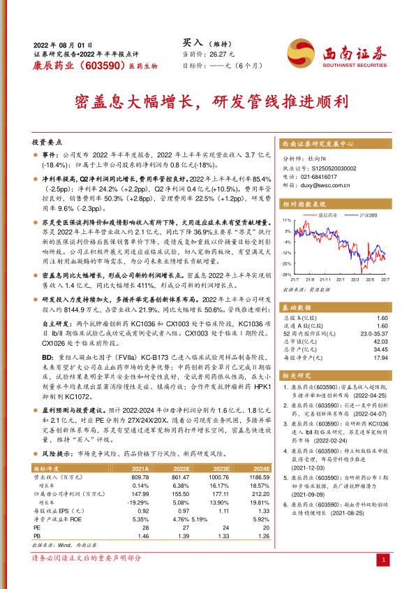 康辰药业2022年上半年业绩受到一定影响,但净利率有所提升,费用管控良好。苏灵收入下降,但犬用适应症有望带来增长;密盖息表现亮眼,成为新的增长点。公司持续加大研发投入,创新药管线稳步推进。维持“买入”评级,但需关注市场竞争、药品降价和新药研发等风险。