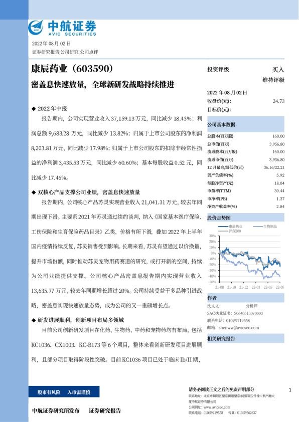我们预计公司2022-2024年摊薄后EPS分别为0.85元、1.00元和1.25元,对应的动态市盈率分别为29.26倍、24.69倍和19.72倍。康辰药业作为我国血凝酶制剂行业细分领域龙头企业,受益于医疗机构手术人次恢复增长,通过持续的研发创新和产品引入丰富产品管线,目前各项研发项目顺利推进,创新中药金草片即将进入临床IⅡ期,未来公司有望迎来创新成果的多样化兑现,维持买入评级。