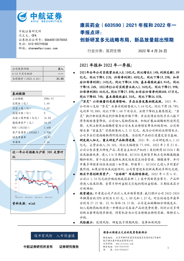 本报告分析了康辰药业2021年年报和2022年一季报,核心观点如下: