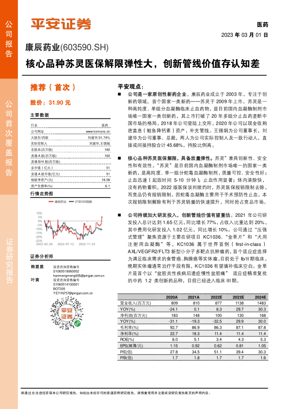 首次覆盖,给予“推荐”评级。我们认为公司基本面变化显著。核心品种苏灵2022版医保解限,放量弹性大,且竞品受地方集采降价限制。密盖息为公司收购重点品种,原研地位竞争优势明显,有望凭借医院覆盖率提升持续扩大规模,同时鼻喷剂型市占率提升空间大。创新管线方面,KC1036晚期实体瘤初步数据亮眼,目前已进入临床II期,有望填补临床空白。金草片针对慢性盆腔炎性疾病后遗症慢性盆腔痛,目前已进入临床III期。我们认为公司研发管线价值尚未被市场充分认知。我们预计公司2022-2024年归母净利润分别为1.00亿、1.30亿、1.68亿元,当前股价对应23年PE为39倍,考虑到创新药管线价值空间,首次覆盖给予“推荐”评级。