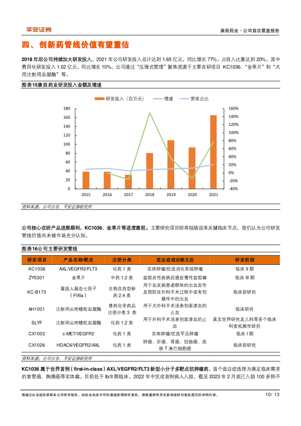 公司持续加大研发投入,创新管线价值有望重估。2021年公司研发投入总计达到1.65亿元,同比增长77%,占收入比重达到20%。其中费用化研发投入1.02亿元,同比增长10%。公司通过“压强式管理”聚焦资源于主要在研项目KC1036、“金草片”和“犬用注射用血凝酶”等。KC1036属于世界首例(first-in-class)AXL/VEGFR2/FLT3新型小分子多靶点抗肿瘤药,首个适应症选择为满足临床需求的食管癌、胸腺癌等实体瘤,目前处于Ib/II期临床。晚期实体瘤通常治疗手段有限,KC1036有望填补临床空白。金草片是首个以“盆腔炎性疾病后遗症慢性盆腔痛”适应症精准复批的中药1.2类创新药品种,目前已经进入临床III期。