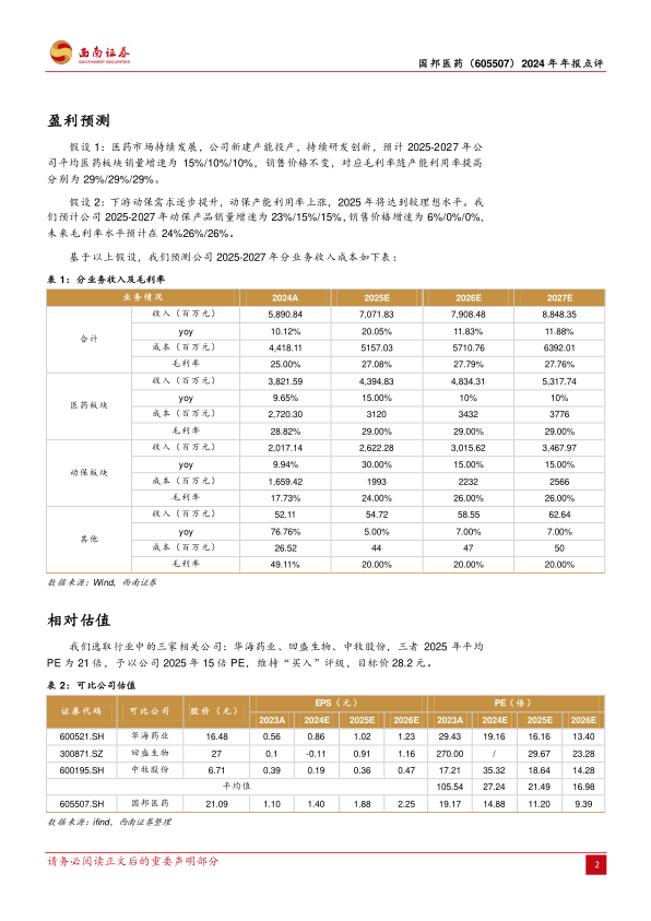 点评:医药与动保双轮驱动,全板块稳健增长。2024年,国邦医药医药板块医药原料药:收入24.77亿元(+11.74%),毛利率28.36%(+6.67pp)。阿奇霉素、克拉霉素等大环内酯类产品价格企稳。中间体收入11.3亿元(+0.83%),出货量创新高;制剂业务与雅培等国际客户合作深化,商业化项目贡献增量。