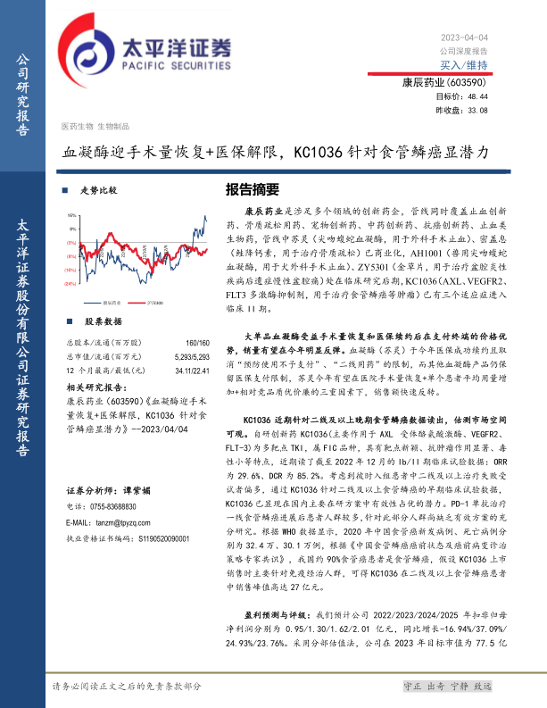 康辰药业作为一家创新驱动型药企,其核心产品苏灵和创新药KC1036是未来业绩增长的关键驱动力。苏灵受益于医保政策的优化和疫情后手术量的恢复,预计销量将实现95%至241%的显著增长。同时,KC1036在二线及以上食管鳞癌治疗中展现出优异的早期临床数据,其多靶点抑制机制具有广谱抗癌潜力,预计销售峰值可达27亿元。公司财务状况已完成筑底,多元化产品管线降低了对单一品种的依赖。基于分部估值法,公司2023年目标市值为77.5亿元,具备46%的上涨空间,因此给予“买入”评级。尽管面临止血药市场竞争、研发进度不确定性及新产品销售能力等风险,但公司凭借其创新能力和市场机遇,未来发展前景广阔。
