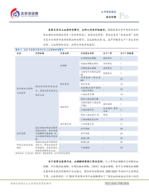风险提示:其他类型止血药的竞争;公司抗肿瘤创新药研发进度不达预期;公司推出新产品后销售能力不及预期