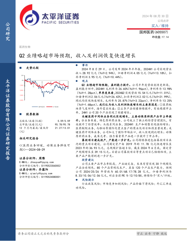 国邦医药2024年上半年业绩表现亮眼,营收和利润均实现快速增长,盈利能力显著提升。这主要得益于医药行业景气度回升、海外市场需求旺盛以及公司在各业务板块的积极拓展。