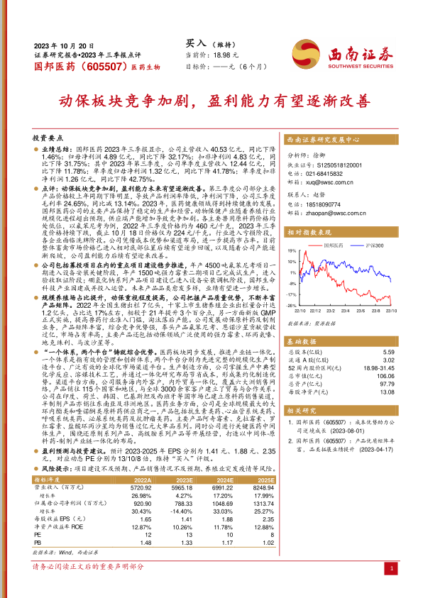 本报告对国邦医药2023年三季报进行了全面分析。尽管短期内公司业绩受到动保板块竞争加剧的影响,但公司通过多元化发展战略、重点项目建设和产业链一体化布局,有望在未来实现盈利能力的改善和业绩的增长。维持“买入”评级,但需关注项目建设进度、产品销售情况以及养殖业疫情等风险因素。