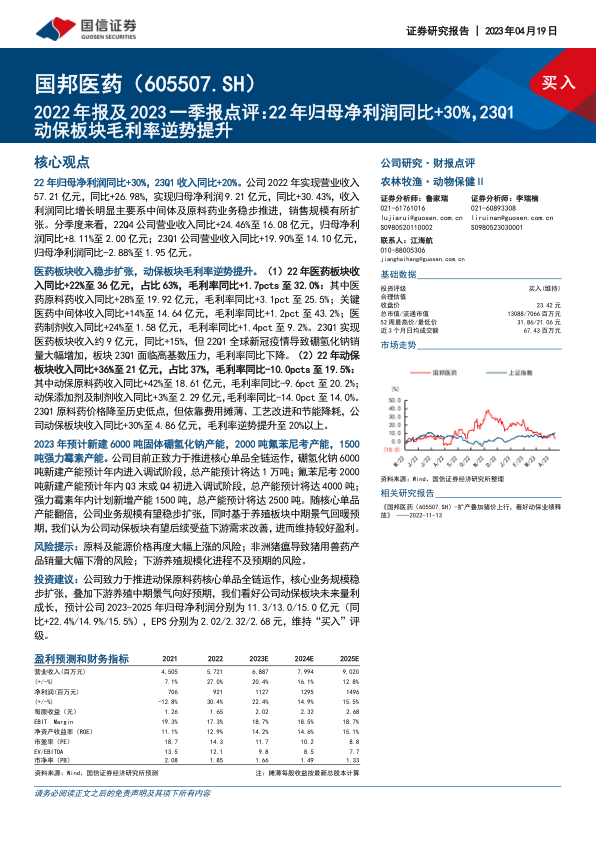 国信证券维持对国邦医药的“买入”评级。预计公司2023-2025年归母净利润分别为11.3亿元、13.0亿元和15.0亿元,同比增速分别为22.4%、14.9%和15.5%。对应的EPS分别为2.02元、2.32元和2.68元。