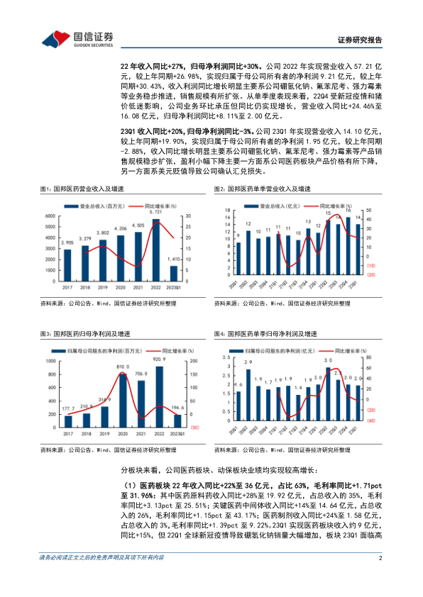 2022年,国邦医药实现营业收入57.21亿元,同比增长26.98%;归母净利润9.21亿元,同比增长30.43%。增长主要系硼氢化钠、氟苯尼考、强力霉素等核心业务稳步推进,销售规模扩张。分季度看,22Q4营业收入同比增长24.46%至16.08亿元,归母净利润同比增长8.11%至2.00亿元。 2023年第一季度,公司实现营业收入14.10亿元,同比增长19.90%;归母净利润1.95亿元,同比下降2.88%。收入增长主要得益于核心产品销售规模扩张,而盈利小幅下降则主要受医药板块产品价格下降及美元贬值导致的汇兑损失影响。