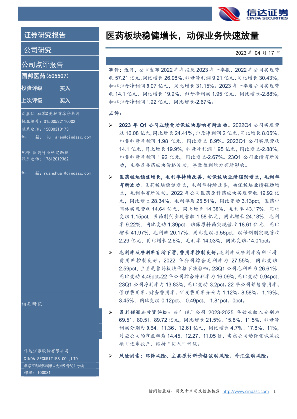 本报告分析了国邦医药发布的2022年年报及2023年一季报,指出公司2023年一季度业绩受到动保板块价格波动的影响。尽管短期业绩有所波动,但医药板块保持稳健增长,毛利率持续改善。展望未来,考虑公司动保领域募投项目逐步投产,维持“买入”评级。