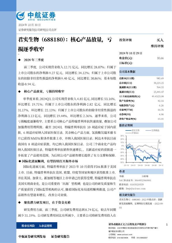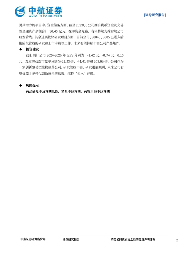 我们预计公司2024-2026年EPS分别为:-1.42元、-0.74元、0.15元,对应的动态市盈率分别为-21.53倍、-41.41倍和203.06倍。公司作为家创新驱动型生物制药公司,研发管线丰富,研发进展顺利,未来公司有望受益于多样化创新成果的兑现,维持“买入”评级。