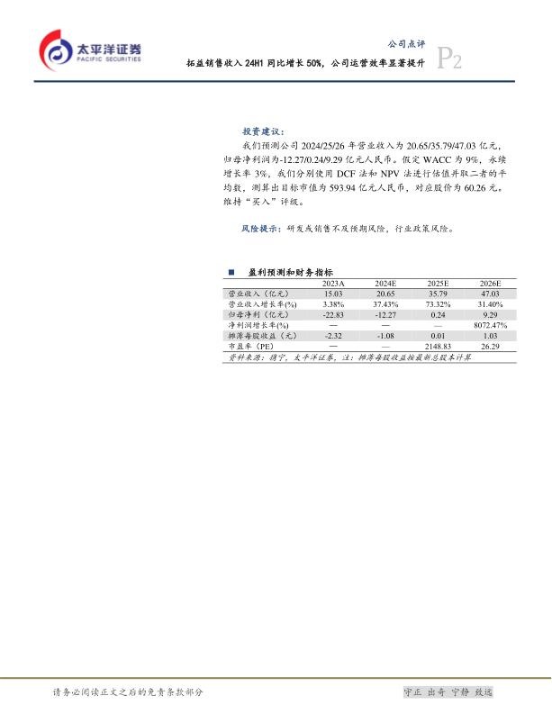 预测公司2024/25/26年营业收入为20.65/35.79/47.03亿元,归母净利润为-12.27/0.24/9.29亿元人民币。维持“买入”评级,目标价为60.26元。