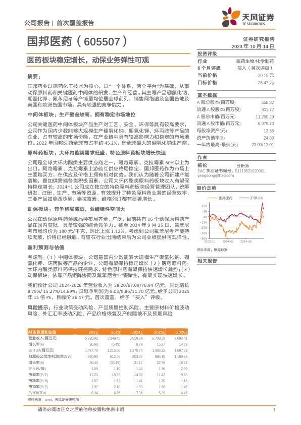 报告强调,国邦医药的业绩增长稳健,尽管2023年受产品价格波动影响有所下滑,但2024年上半年已呈现恢复态势,利润增速优于收入增速,显示出良好的管理水平和竞争能力。公司通过员工持股计划进一步激发了内部活力。展望未来,中间体业务的高壁垒和稳定需求、大环内酯类原料药的持续旺盛需求、特色原料药的快速发展以及动保板块氟苯尼考价格回升带来的业绩弹性,共同构成了公司未来业绩增长的核心驱动力。基于此,报告给予国邦医药“买入”评级,并设定了明确的目标价格,体现了对其市场领先地位和未来增长潜力的信心。