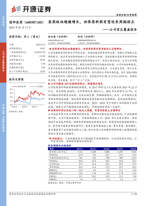 国邦医药作为医药原料药及动保原料药领域的领先企业,凭借其稳健的医药板块增长和动保业务的周期性拐点,展现出显著的投资价值。公司在医药原料药方面,大环内酯类产品销量持续增长,特色原料药新品快速放量;在关键医药中间体方面,市场份额高且价格企稳。尤其是在动保原料药领域,随着行业供给出清和需求复苏,氟苯尼考、强力霉素等核心产品价格回升,预示着该板块将迎来业绩大幅增长的机遇。公司清晰的股权结构、经验丰富的管理团队、持续的研发投入以及新建产能的释放,共同构筑了其长期发展的坚实基础。尽管面临产品价格波动、政策变化、汇率及原材料价格波动等风险,但公司凭借其估值优势和未来增长潜力,首次覆盖给予“买